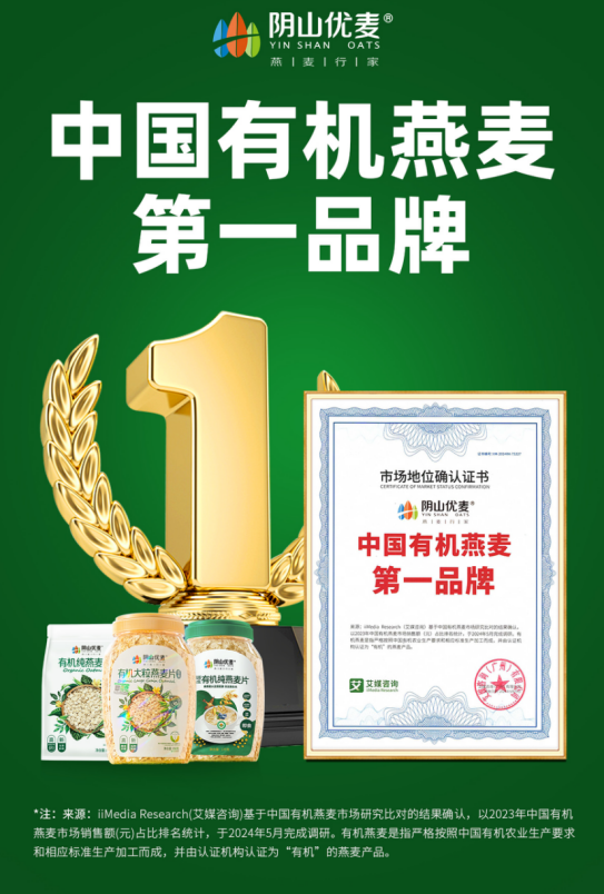2024年5月,陰山優(yōu)麥獲艾媒咨詢授予的“中國有機(jī)燕麥第、一品牌”市場地位認(rèn)證書,此項認(rèn)證,是陰山優(yōu)麥品牌發(fā)展史上的一個重要里程碑,標(biāo)志著陰山優(yōu)麥在有機(jī)燕麥行業(yè)取得領(lǐng)導(dǎo)地位。